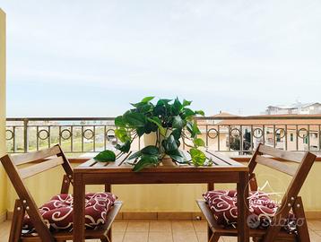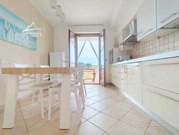 Trilocale con 4 posti: luminoso e accogliente soggiorno, spazio living confortevole, arredato con gusto. Cucina abitabile completamente attrezzata, funzionale per ogni esigenza. Camera Matrimoniale accogliente e ben arredata. Bagno moderno dotato di cabina doccia. Balcone abitabile con una splendida vista mare, perfetto per pranzi o cene all'aperto. Appartamento dotato di lavatrice.