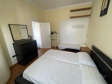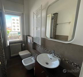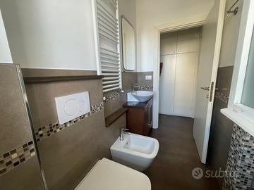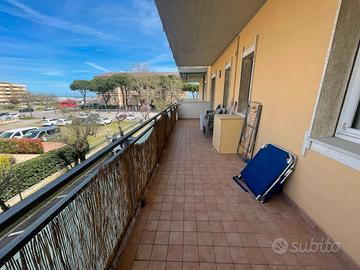 Affittiamo in Viale Carducci zona Bagno Marconi, a pochi passi dal mare, al 1° piano con ascensore di una piccola palazzina, un bilocale ristrutturato così composto: soggiorno/pranzo con divano-letto a una piazza e mezzo e tv, cucinotto con lavastoviglie e microonde, disimpegno zona notte con armadio a muro, camera matrimoniale + 3° letto, bagno con box doccia. Ampia terrazza attrezzata con tavolo e sedie e lavatrice e vista mare. A disposizione un posto auto (non assegnato) e posto bici.