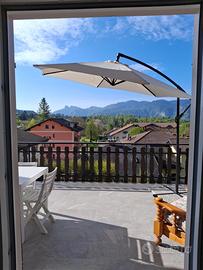 L'ampia terrazza, attrezzata con tavolo, sedie ed ombrellone, si affaccia sulle montagne e sul verde e permette di mangiare all'aperto in totale relax.