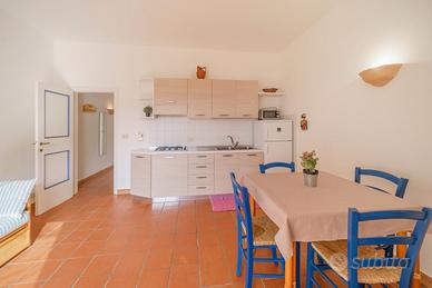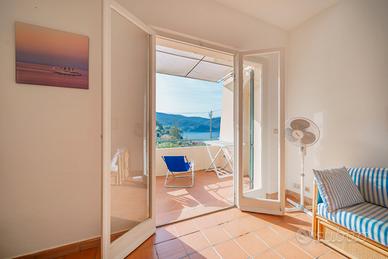 Luminoso bilocale situato al primo piano, vanta infatti una terrazzina con vista mare su cui si può comodamente mangiare. La struttura è costituita da un ingresso, una camera matrimoniale, una zona living con cucina completamente rinnovata nel 2016 con divano letto (due letti separati), e un bagno con doccia.