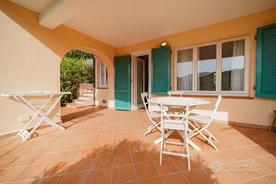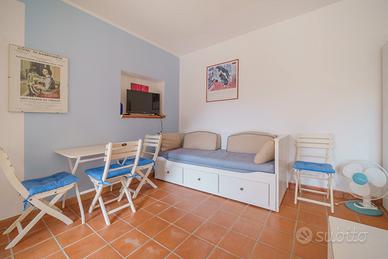 Spazioso monolocale posto al piano terra con sbocco sul giardino. E' composto da una zona living con letto matrimoniale e divano letto singolo, la cucina finestrata è dotata di forno elettrico, è separata dalla zona soggiorno ed e' stata rinnovata completamente nel 2016. Completa l'appartamento uno spazio esterno terrazzato attrezzato per mangiare.