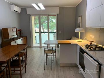 E' composto da ampio soggiorno/pranzo con cucina a vista e divano letto, camera matrimoniale, camera con letto ad una piazza e mezzo, 2 bagni entrambi con box doccia, disimpegni vari, 2 balconi.