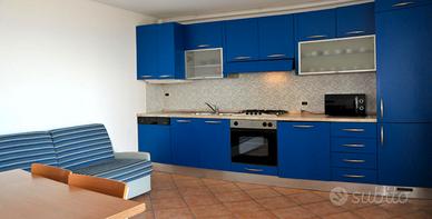 Si compone di: terrazzo perimetrale, terrazzo panoramico coperto (circa mq 30), zona giorno con angolo cottura e divano letto matrimoniale, disimpegno, bagno finestrato con box doccia, camera matrimoniale, camera con letto singolo e letto estraibile.