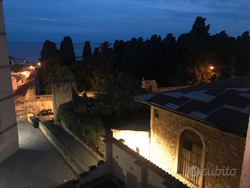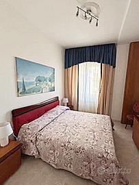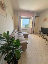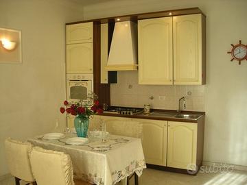 Affitto giornaliero o settimanale grazioso appartamento vista mare a San Remo in via Tivoli con due camere da letto matrimoniali, accogliente salotto con divano letto imbottito a penisola moderno color sabbia , cucina a vista con lavastoviglie, lavatrice, forno elettrico, microonde e bagno con ceramiche in stucco veneziano con box doccia.