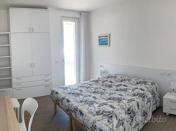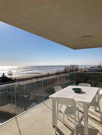 Appartamento fronte mare al secondo piano di un residence di nuova costruzione, splendida vista, 5 posti letto, classe energetica A3, dotato di ascensore e solarium. Composto da angolo cottura, soggiorno con divano, 2 bagni dotati di box doccia, 1 camera matrimoniale, 1 camera con 3 posti letto, terrazzo posteriore con stendibiancheria, ampio terrazzo coperto fronte mare attrezzato con tavolo esterno e 2 sdraio. Aria condizionata in tutte le stanze, tapparelle elettriche, TV, piano cottura a induzione, forno, forno a microonde, lavastoviglie e lavatrice. Dotazione stoviglie, pentole, accessori cucina inclusi.