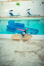 L'appartamento è situato al primo piano all'interno di una villa di proprietà, di 90 metri quadri, ove l'uso della piscina è ad uso esclusivo dell'appartamento, collegato alla piscina da una scala esterna a chiocciola. Lo spazio esterno accanto alla piscina è attrezzato di un gazebo di circa 100mq. con tavolo, divano e TV a schermo piatto, spogliatoio con wc e lavabo, e due docce esterne a disposizione degli ospiti.