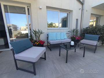 Affittasi appartamento in villa bifamiliare nella zona nuova alta di Marina di Ragusa a 800 metri dalla spiaggia e dal lungomare. È composto da cucina soggiorno, 2 camere da letto matrimoniali, 2 bagni, veranda attrezzata, giardino, piscina condivisa con un altro appartamento.