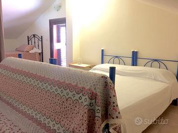 L'appartamento è composto da cucina soggiorno, camera da letto matrimoniale , cameretta, ripostiglio, bagno doccia, mansarda completamente indipendente accessibile da scala interna con un altro letto matrimoniale, lettino, divano letto e bagno doccia, l'appartamento consente il soggiorno anche di due coppie e fino ad un massimo di sei persone mantenendo e garantendo una tranquillissima privacy. Posto auto privato giardino e terrazzo panoramico vista mare.