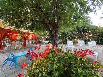 GIARDINO COMUNE ALBERATO: 2 gazebo con tavoli e sedie, barbecue in muratura, salottini e dondoli, doccia esterna.