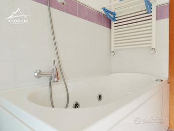 E' composto da ingresso, soggiorno con un divano letto, angolo cottura, disimpegno, camera matrimoniale, una camera con due letti (letto estraibile), un bagno di servizio con doccia (ad uso lavanderia) un bagno con vasca e accesso a balconcino dotato di tenda da sole.