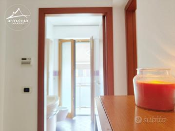 E' composto da ingresso, soggiorno con un divano letto, angolo cottura, disimpegno, camera matrimoniale, una camera con due letti (letto estraibile), un bagno di servizio con doccia (ad uso lavanderia) un bagno con vasca e accesso a balconcino dotato di tenda da sole.