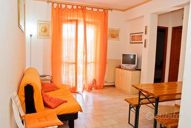 Il trilocale dispone di ampia terrazza abitabile attrezzata per stare e mangiare all'aperto fino a 6/7 persone. Dispone dai 4 a 6 posti letto, con la possibilità di aggiungere 1 ulteriore posto letto (branda). I posti letto sono disposti in 1 camera matrimoniale e l'altra con due letti basse ed unibili