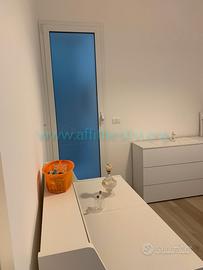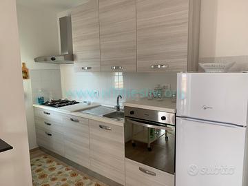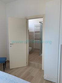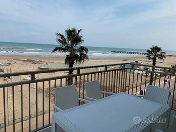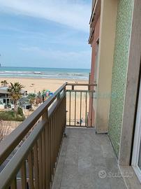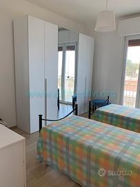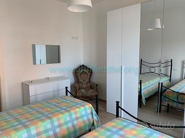 Appartamento sito al quinto piano di una palazzina con ascensore ubicata in centro a 350 mt. dalla stazione ferroviaria e 100 mt. dal mare. Si compone di tre camere di cui una con letto a castello, una con due letti singoli, di cui uno a cassetto, una con letto matrimoniale, due bagni, di cui uno con box doccia, una terrazzo arredato perimetrale panoramico da cui si vede il mare, la città e la collina. Soggiorno con divano letto o due letti singoli, due brandine, a scelta possiamo fornire la soluzione migliore che preferite. L'arredamento è nuovissimo e moderno e l'appartamento completamente ristrutturato con porte, infissi, pavimenti e bagni completamente nuovi e moderni. Ci sono dai 6 agli 8 comodi posti letto, in base alle esigenze. In dotazione tv, lavatrice, lavastoviglie, aria condizionata.