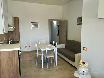 L'appartamento è composto da disimpegno d'ingresso, ampio soggiorno con zona pranzo e cucina attrezzata, letto matrimoniale, bagno, balcone. E' dotato di climatizzatore e di lavatrice/asciugatrice, nonché di tutti i complementi necessari.