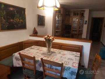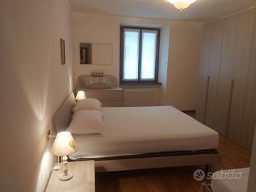 Affittasi in luglio, agosto e settembre confortevole appartamento al I^ piano, arredato con mobilio di pregio in legno, per cinque persone. Possibilità di 6^ letto: o in culla con materasso ortopedico per bambino fino a 4 anni o in rete con doghe in legno da collocare nell'ampia camera da letto matrimoniale arredata con mobilio nuovo e con materasso ortopedico. Presente seconda camera con due letti singoli. Corridoio con armadio-scarpiera e comodo appendiabiti con mensola e specchio. Bagno con vasca, box doccia, sanitari e phon a disposizione. Ambiente unico con cucina molto ampia e sala con divano a tre posti, pouf, mobile angolare con tv via cavo. Cucina con tavolo con panca angolare e ampia penisola in granito ideale per la colazione. E' dotata di tutti i comfort: lavastoviglie, frigo con vano congelatore, forno elettrico programmabile, gas a 5 fuochi, microonde, macchina per il caffé tedesco e a cialde Lavazza a Modo Mio, bollitore, tostapane, tritatutto elettrico, sbattitore elettrico con 2 fruste, pentole acciaio inox e stoviglie. C'è wifi. L'appartamento si trova al limitare del paese con giardino attrezzato sul retro che spazia sull'incantevole fondovalle. Nel giardino vi sono: ombrellone grande a braccio con tavolo e panche in legno, 2 sdraio e barbecue. E' un luogo ideale per rilassarsi, prendere il sole e fare grigliate. Su richiesta possibilità di rimessa per biciclette ma non custodita. Bar nelle vicinanze e negozio alimentari a 150 mt. Parcheggi nelle vicinanze.