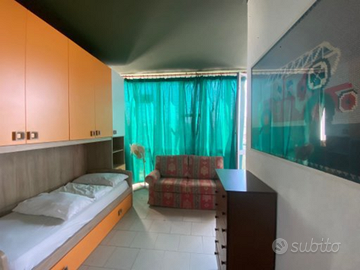 L'appartamento in residence con piscina, fronte mare, pieno centro turistico, al primo piano con ascensore e posto macchina dispone di una camera matrimoniale, camera con due letti, soggiorno con angolo cottura e letto con possibilità di separé, bagno e due ampi terrazzi.