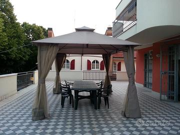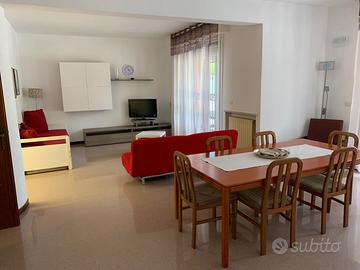Splendido appartamento di oltre 100mq con 120mq di terrazzo per affitti brevi settimanali, quindicinali, fino a 30 giorni in ogni stagione; a 100 metri dalla passeggiata e a 400 metri dalla spiaggia centrale, con aria condizionata, bagno con doccia idromassaggio, wi-fi, forno, forno microonde, lavastoviglie, sala lavanderia attrezzata e box auto privato. A pochi metri dai servizi, accanto al parco comunale. Il terrazzo nei periodi caldi è attrezzato con gazebo, tavolo da esterno, sedie e sdraio.