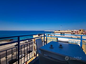 Appartamento sul mare, fronte spiaggia, con ampio balcone al quinto piano a Gallipoli. La posizione geografica è unica: affacciato sul lungomare di Gallipoli con una vista fantastica sul mare e il centro storico, l'appartamento offre 4 posti letto con un grande balcone abitabile che prende metà del perimetro della casa, di più di 120 mq.