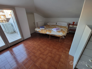 Appartamento in affitto per 6 persone + culla con accesso riservato diretto al mare. Offre 1 camera matrimoniale, 1 tripla, salone con divano letto, cucina attrezzata e 2 bagni. Tutte le stanze sono dotate di condizionatori. Goditi un ampio terrazzo dove mangiare all'aperto, giardino con barbecue, posto auto privato e cabina mare. Spazi dotati di ogni comfort per una vacanza rilassante in un residence riservato. Non sono ammessi animali in casa. Nelle immediate vicinanze è presente un supermarket e 2 ristoranti (di cui uno sulla spiaggia).