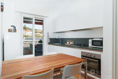 Appartamento attico con ampio terrazzo, con ascensore. Bilocale completamente ristrutturato, molto spazioso e luminoso, con vista sulla collina e sul mare, con possibilità di ospitare 4 persone. Si colloca in una zona molto tranquilla a due passi dal mare e a 10 minuti a piedi dal centro.