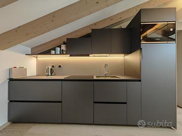 Ampia cucina completamente attrezzata e dotata di elettrodomestici tutti di marca Bosch piano induzione, lavastoviglie, forno microonde, bollitore e stoviglie varie, posate, pentole e padelle.