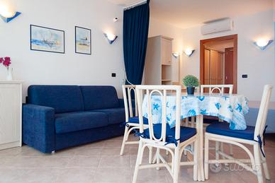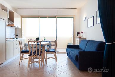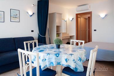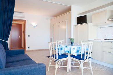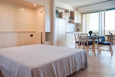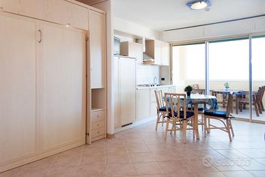 Spazioso e luminoso monolocale con terrazzo chiuso vista mare attrezzato, all'interno di in un complesso residenziale con piscina.