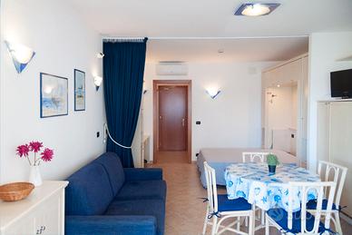 L'appartamento si trova al terzo piano di un residence con ascensore, di circa 40 mq, è composto da soggiorno con angolo cottura, letto matrimoniale e divano letto matrimoniale; bagno con doccia; terrazzino chiuso a veranda vista mare attrezzato con arredamento da esterno. Parcheggio privato incluso, barbecue condominiale e piscina. La sua posizione alta lo rende silenzioso ed estramente panoramico.
