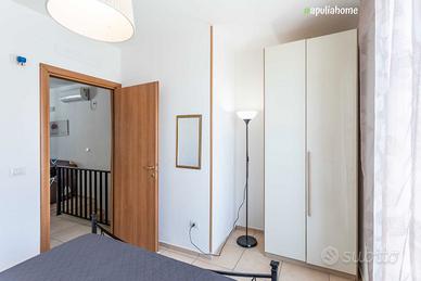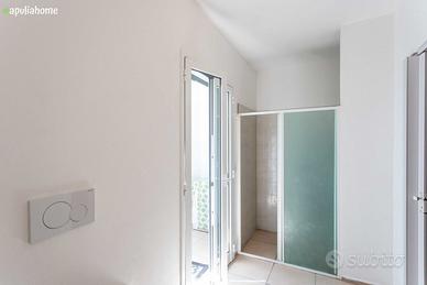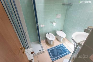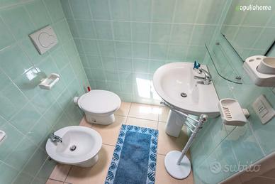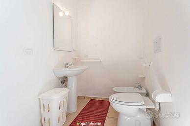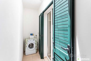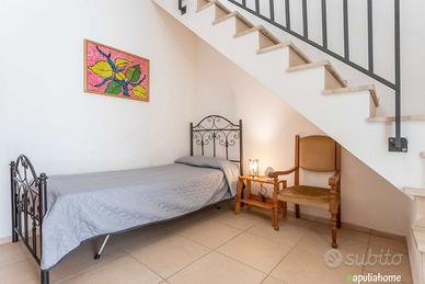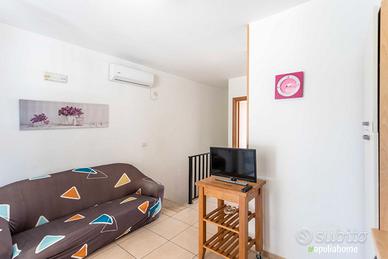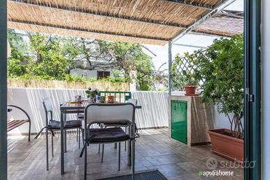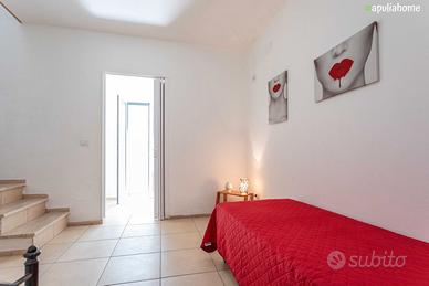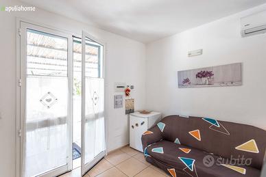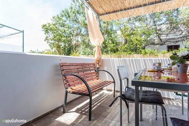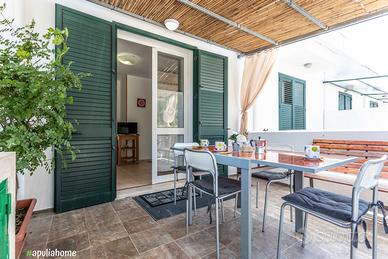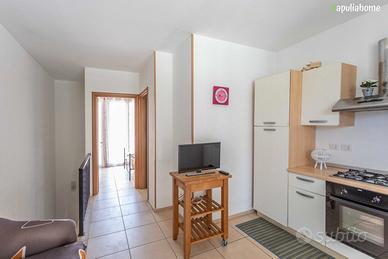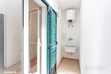 Appartamento di nuova costruzione in località marina di Mancaversa, zona di vacanza contigua a Gallipoli, con cui condivide il tratto costiero a sud della cittadina, subito dopo la spiaggia di Punta Pizzo; l' appartamento con ingresso indipendente al piano terra, è organizzato su 2 livelli, dotato di veranda fronte/retro arredata con mobili da giardino.