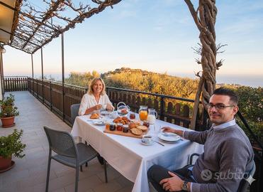 L'alloggio, all'interno di un agriturismo in Imperia, è dotato di ampi spazi esterni, terrazza e giardino con vista mare attrezzato di sedie, tavolo, sdraio e barbecue è composto da ampio soggiorno con televisione satellitare e balcone vista mare, cucina con lavastoviglie e forno elettrico professionale, 2 camere da letto (di cui una con un letto matrimoniale e un letto singolo e una con due letti singoli), bagno con lavatrice, connessione internet wi-fi gratuita, parcheggio privato, riscaldamento, ferro e asse da stiro.