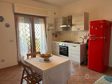 Affitto estivo quindicinale o mensile (giugno-luglio-settembre). Trilocale situato a pochi passi dal mare composto da: zona giorno - con soggiorno e cucina a vista, divano letto e terrazzo vista mare; zona notte - con ampia camera matrimoniale, cameretta con due posti letto e bagno con doccia finestrato. Tramite scala esterna si raggiunge un terrazzo panoramico dotato di doccia, tenda e barbecue. L'appartamento è arredato con tutti i comfort per un piacevole soggiorno di 6 persone.