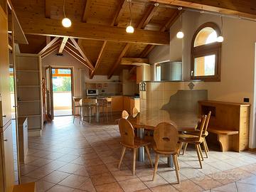 Attico in legno di 100 mq, open space, circondato su tre lati da balconi e grandi terrazze. Con vista verso le Dolomiti di Brenta e verso le piste da sci a ridosso della casa.