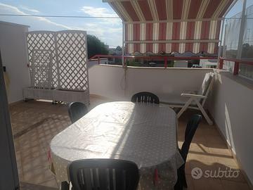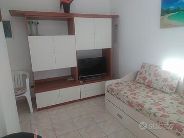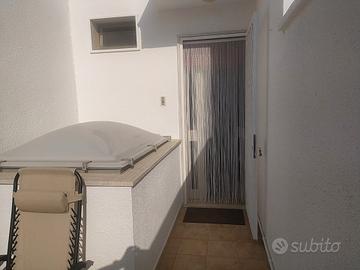 A circa 350 mt dalla spiaggia libera privato affitta al primo piano di casa singola, un piccolo attico di circa 45 mq con 5 posti letto, dotato di tutti i confort e così composto: -Cucinino con forno, grande frigo con capiente congelatore, stoviglie e tutti gli attrezzi da cucina come nuovi. (v.foto) -Tinello con tavolino allungabile e con divano contenente due letti sovrapposti e separabili (v.foto). TV, ambiente HiFi -Camera con matrimoniale + letto singolo ( v. foto)e capienti armadi con a disposizione, biancheria per letto, bagno e cucina.(v.foto) Disponibili ferro, asse da stiro e aspirapolvere a carrello. -Bagno con grande doccia 120x90 cm in muratura,(...nessuna tenda appiccicosa...), lavatrice con carica dall' alto, comoda scarpiera, stendino e phon (v.foto) -Grande terrazza di oltre 20mq, ombreggiata con tenda avvolgibile (v.foto) attrezzata con tavolo allungabile (con 6 sedie), due poltrone prendisole, tre luminosi punti luce, prese elettriche, armadio porta scope, doccia esterna La posizione della terrazza, arretrata rispetto alla strada, libera su tre lati e ben protetta garantisce tranquillità e una notevole privacy. La terrazza è isolabile con cancelletto dalla scala di accesso (sicurezza bimbi e ... cagnolini) -Acqua corrente potabile da acquedotto e scaldabile con pannello solare. -Silenzioso condizionatore inverter da 12000 BTU con unità esterna lontana sul tetto. -Porta e finestre sono dotate di griglie di sicurezza e retine antizanzare, per poter tenere arieggiato in sicurezza, anche di notte. -Posto auto custodito in terreno di proprietà di fronte all' alloggio chiuso con cancello e lucchetto.( v. foto) L' alloggio è in una tranquilla via frequentata solo dai residenti, ma vicino a negozi e servizi e la spiaggia è comodamente raggiungibile a piedi in tre/quattro minuti. (V. foto) L' alloggio è in via Lazio 17, quasi angolo via Taranto e lo preciso perché alcune Maps non sono corrette
