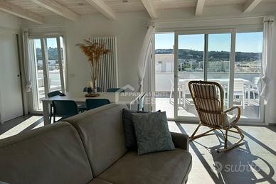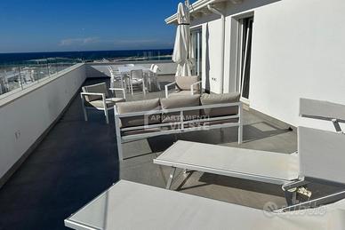 Ampia vista mare sul Lungomare Europa e porto turistico. Veranda / Solarium corredata da lettini. Piccola cucina anche all'esterno