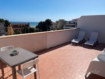 Attico per 2-3 persone di nuova costruzione, a Strongoli Marina, Costa ionica, a 100 metri dal mare, vista panoramica. Aria condizionata, lavatrice, ampio terrazzo panoramico.