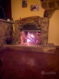 Soggiorno con camino, stufa a legna, tavoli e tv.