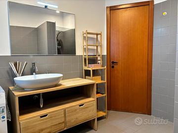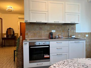 Ampio soggiorno con cucina e comodo divano, una camera da letto matrimoniale e bagno con box doccia e lavatrice. Piano terra.