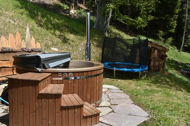 Il giardino esterno è dotato di un tavolo da pranzo, un'area barbecue per gustose grigliate e un'area giochi per i più piccoli con casetta, scivolo e trampolino elastico. Il giardino offre uno spazio ideale per rilassarsi, godersi il panorama e trascorrere momenti piacevoli nella tinozza finlandese idromassaggio con acqua di sorgente riscaldata a legna. Wi-Fi in tutta la casa.