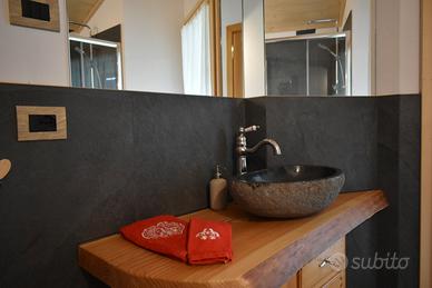 La struttura è ben organizzata, con il piano inferiore che ospita una spaziosa area pranzo con soggiorno con TV 55'' e stufa in maiolica, cucina completamente attrezzata (frigo freezer lavastoviglie forno e cucina economica) bagno e un pratico ripostiglio con lavatrice.