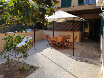 Trilocale a 200 mt dalla spiaggia di Reale, nel comune di Porto Azzurro, a 2 km dal centro del paese e a 6 km dal centro di Capoliveri. Appartamento immerso nel verde e nella tranquillità, composto da soggiorno con angolo cottura e piano a induzione, grande frigo con congelatore, tv satellitare 28 pollici HD, divano letto matrimoniale, tavolo in legno pieghevole e sedie pieghevoli. Camerina con letto a castello e armadio a 2 ante. Grande camera matrimoniale con armadio 4 ante, armadietto 2 ante, armadio basso 2 ante e scarpiera. Disimpegno. Grande bagno con box doccia, lavatrice con carica dall' alto e armadietto 2 ante. Giardino/spazio esterno privato di 60 mq, recintato con muro e cancello in ferro battuto, in parte coperto, con gazebo, tavolo, 6 sedie, chaise longue in legno. Posto auto privato e coperto con ombreggiante .