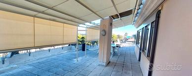 Ampio terrazzo panoramico attrezzato con lettini, tavolo, sedie, doccia esterna e tenda
