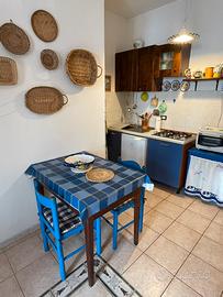 Al piano terra sono presenti la cucina, il bagno e una corte privata attrezzata, ideale per mangiare all'aperto, con tavolo, sedie e ombrellone.