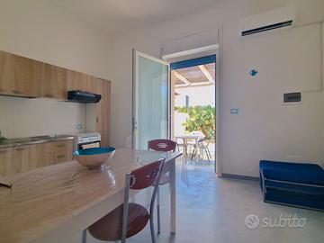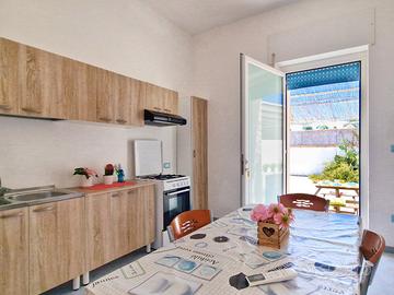 COMPOSIZIONE: ingresso cucina con tv schermo piatto, piccola cucina con 4 fornelli piccoli e mini frigo, una camera matrimoniale minimal e un bagno con doccia con tenda senza box. Spazio esterno per mangiare fuori. 1 SPLIT CLIMA IN CUCINA.