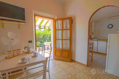 Situato in una zona residenziale, l'appartamento offre un piccolo spazio esterno attrezzato all'ingresso. Dal patio si accede al soggiorno con divano letto matrimoniale e zona pranzo, mentre l'angolo cottura, separato, è completo di utensili. La camera matrimoniale, ampia e luminosa, può ospitare anche una culla ed è dotata di aria condizionata. Completa la dotazione un posto auto privato.