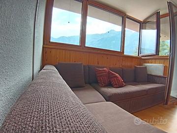 Soggiorno con zona pranzo, divano ad angolo che può diventare 2 letti singoli) e terrazzo con magnifica vista sulle montagne