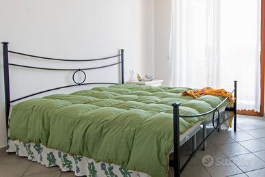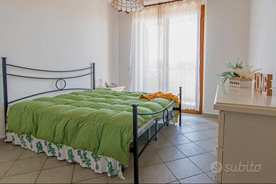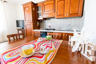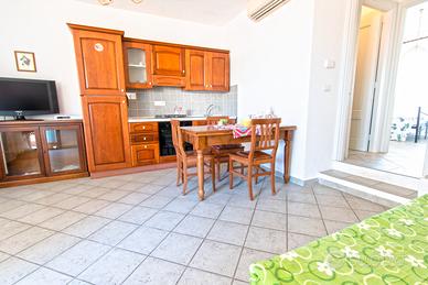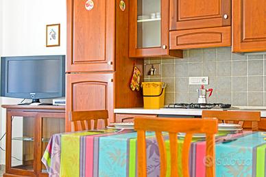 Bilocale al piano rialzato, con soggiorno e angolo cottura e divano letto matrimoniale. Due gradini conducono al bagno con box doccia e lavatrice e alla camera matrimoniale con terrazza vista mare. Dotato di aria condizionata, WI-FI, TV, frigorifero con congelatore, forno e posto auto privato. Animali ammessi su richiesta. Arredamento curato, ideale per vacanza al mare in totale relax.