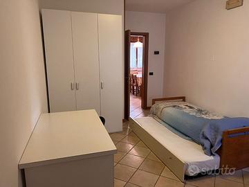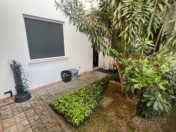 E' composto da ingresso indipendente su soggiorno/pranzo con cucina a vista, bagno con box doccia, camera matrimoniale, stanzetta con lettino singolo + letto estraibile, giardinetto privato, posto auto recintato.