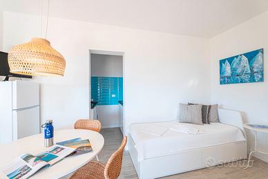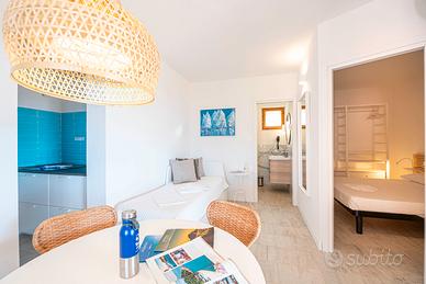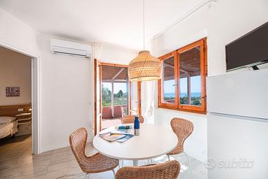 Il bilocale, recentemente ristrutturato, può accogliere fino a 4 persone. Gli interni comprendono un soggiorno con angolo cottura e divano letto matrimoniale, una camera matrimoniale e un bagno con doccia. All'esterno è presente uno spazio attrezzato con tavolo e sedie per momenti di relax all'aperto. L'appartamento è dotato di aria condizionata, Wi-Fi, televisione, frigorifero, lavatrice e microonde. La struttura include barbecue e parcheggio; gli animali non sono ammessi. La spiaggia di Lacona dista circa 1200 metri.