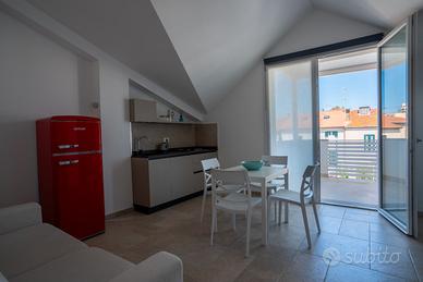 Appartamento di 2 locali, al secondo piano all'interno di una piccola struttura completamente ristrutturata nel 2025 e molto silenziosa. La casa è spaziosa e luminosissima con arredamento moderno e di buon gusto: soggiorno/sala da pranzo con 1 divano letto doppio, tavolo da pranzo e zona cucina completa di ogni accessorio (lavastoviglie, fuochi, tostapane, bollitore elettrico, forno a microonde, macchina del caffè). Uscita su terrazza coperta di con tavolo e sedie. Abbiamo poi una camera matrimoniale e un bagno completo di tutto.