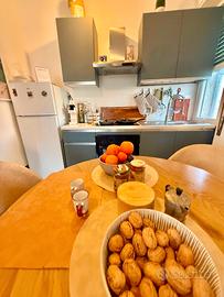 o in fondo alla zona soggiorno con cucina moderna a induzione, tavolo da pranzo e divano letto matrimoniale