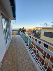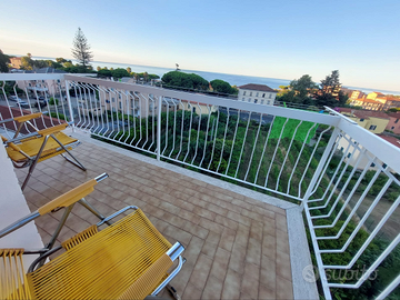 Villa Glicine - spazioso, al 4° ed ultimo piano con ascensore, vista mare e monti con terrazzo ad angolo dotato di tenda veranda completo di tutti i comfort per 5 persone con due Tv in cucina e camera e tutto il necessario quali piatti, bicchieri, pentole, posate, forno microonde, scopa elettrica, phon, coperte e cuscini, a cinque minuti a piedi dal mare e dal Borgo Medioevale, con parcheggi sotto casa, giardino pubblico e Supermercato: nelle immediate vicinanze Posta, Farmacia, Tabaccaio ed altri negozi.